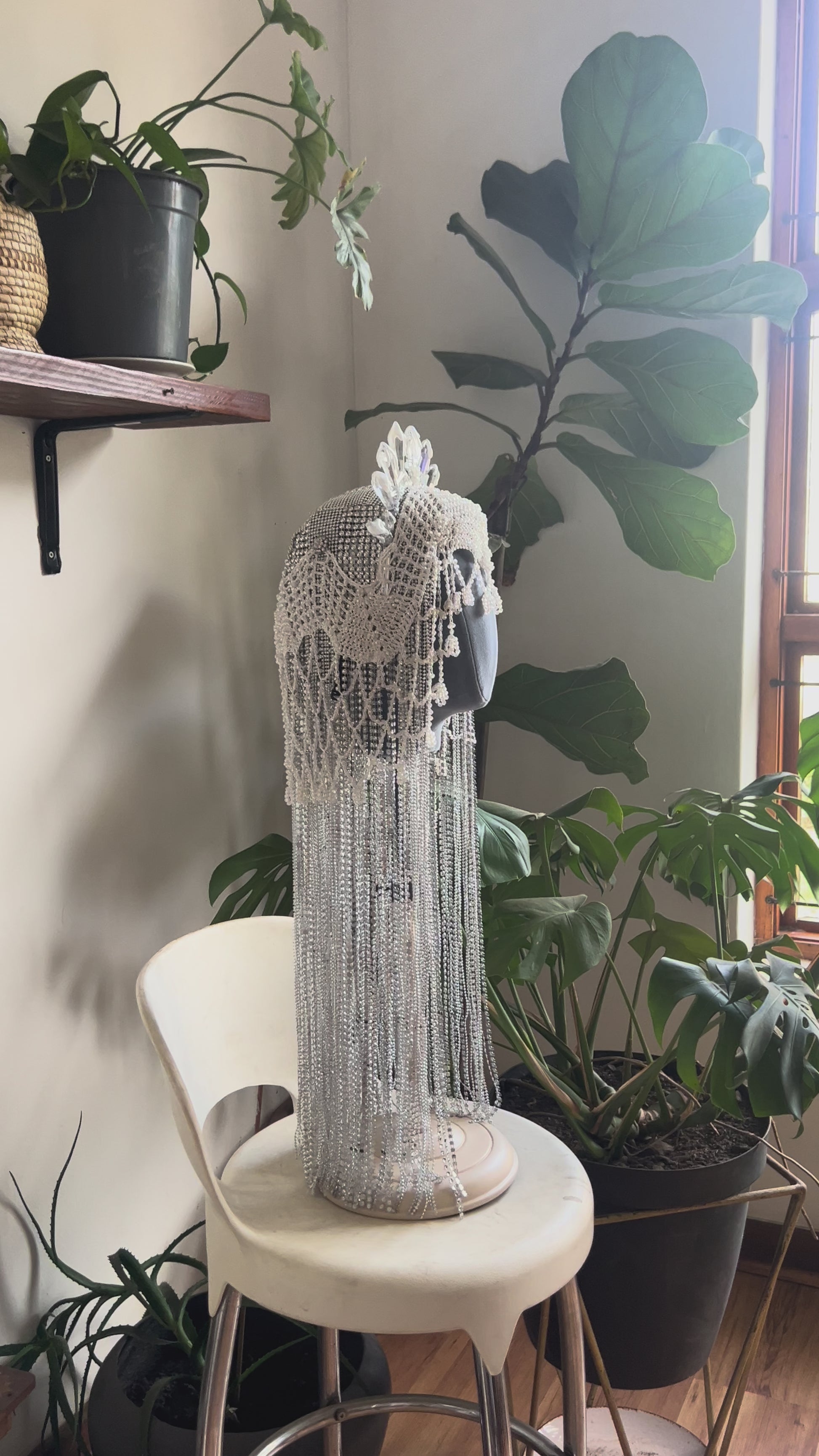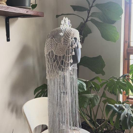 This handmade silver and white headdress is designed to capture light and attention. Featuring a dramatic crown of iridescent crystal prisms, a white crocheted veil, and cascading silver rhinestone mesh, it blends fantasy, elegance, and ethereal charm.