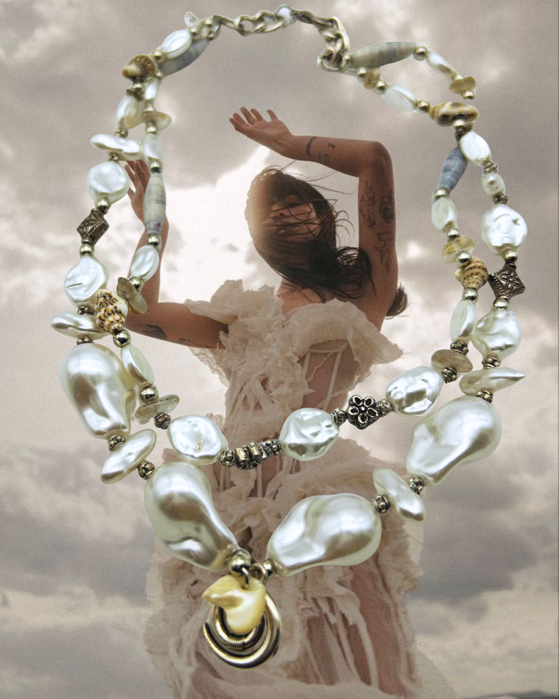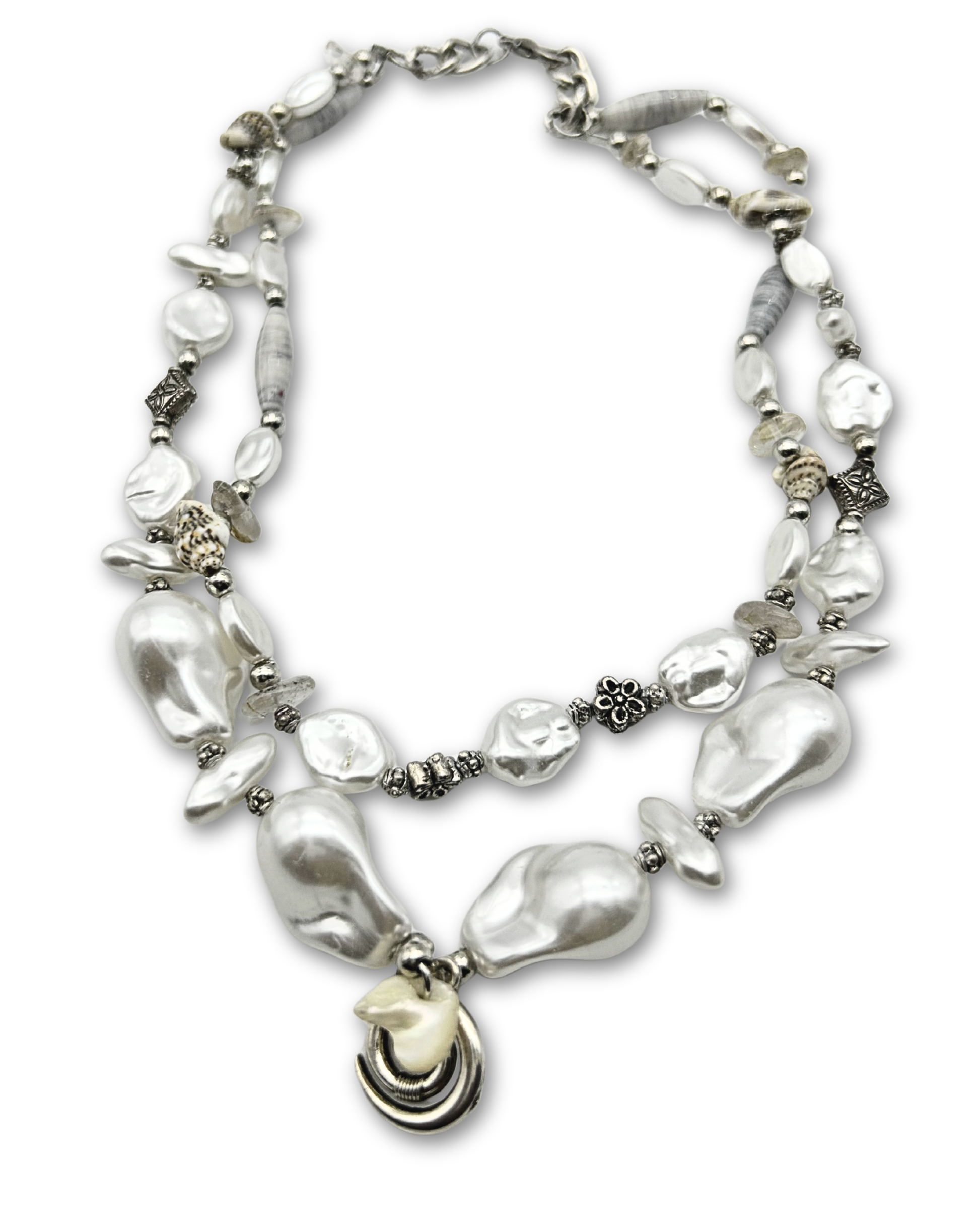 Irregular faux freshwater pearls set the rhythm of the piece, interrupted by organically shaped accents: polished mollusc shell spindle beads, clear quartz chips, and small natural shells dispersed throughout.