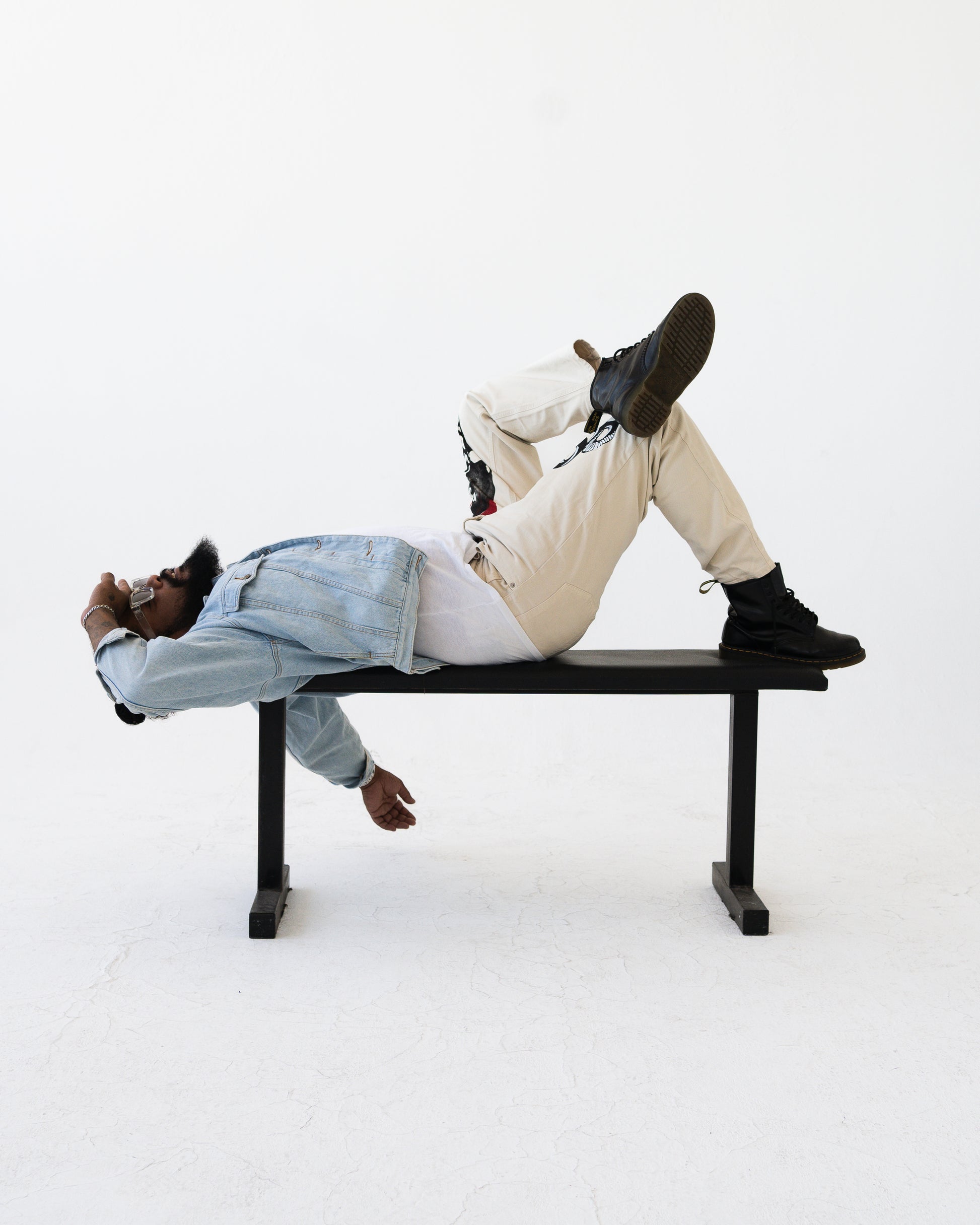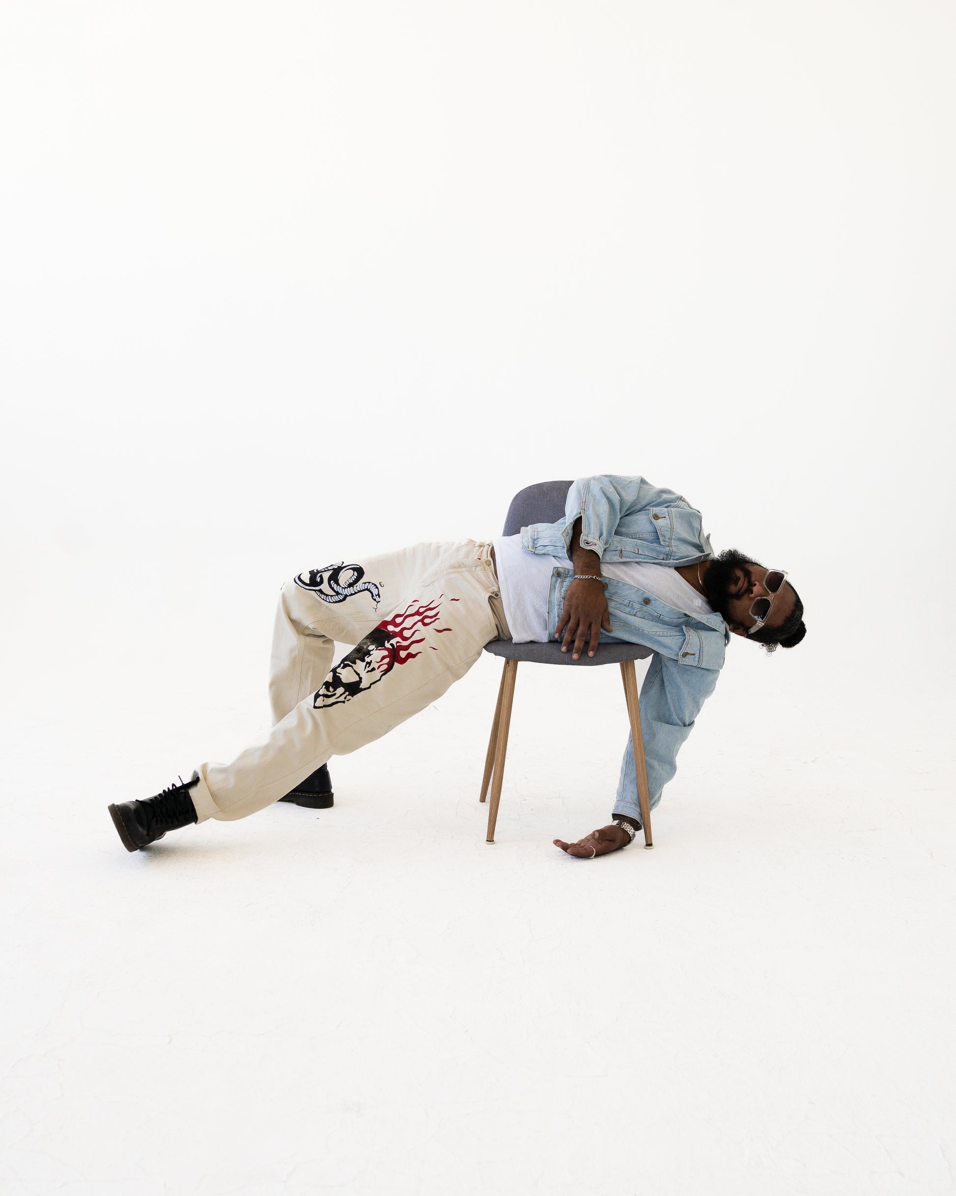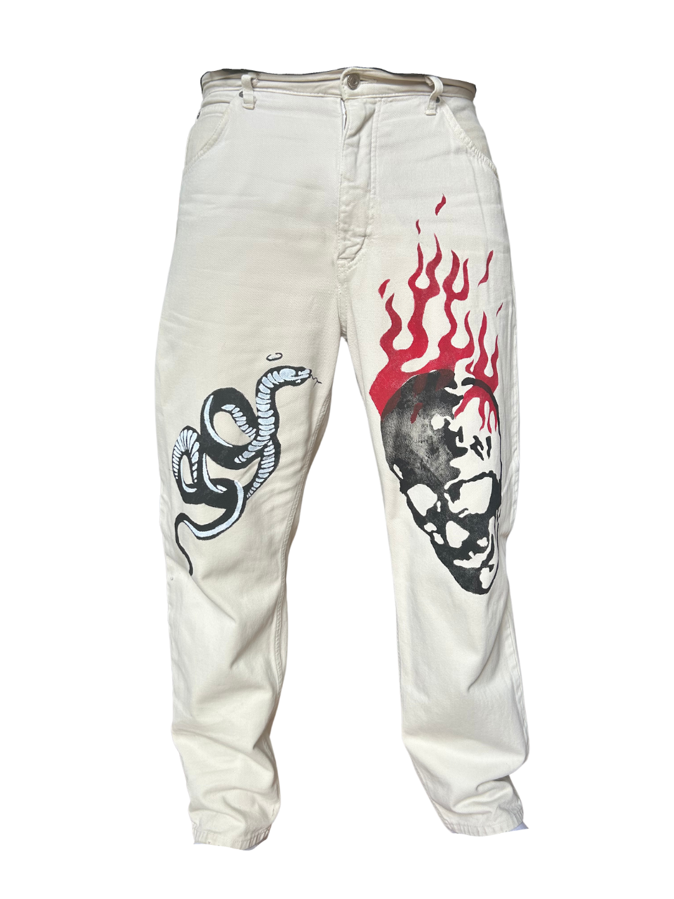 Customised men's baggy chino, beige, with hand-painted skull & snake design.