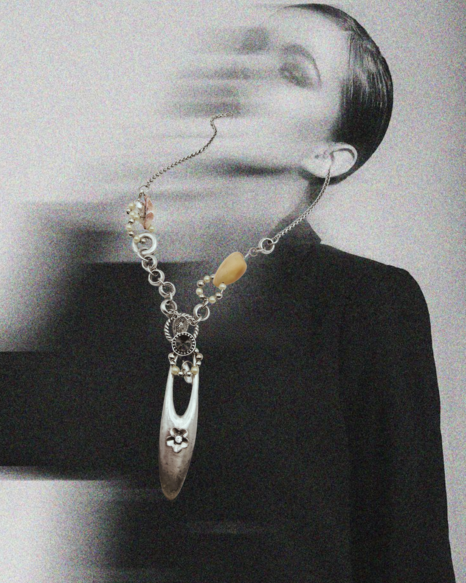 The reclaimed deadstock necklace base is interrupted by real shells collected along Cape Town’s coastline, threaded alongside freshwater pearls and polished metal beads that alternate in rhythm.