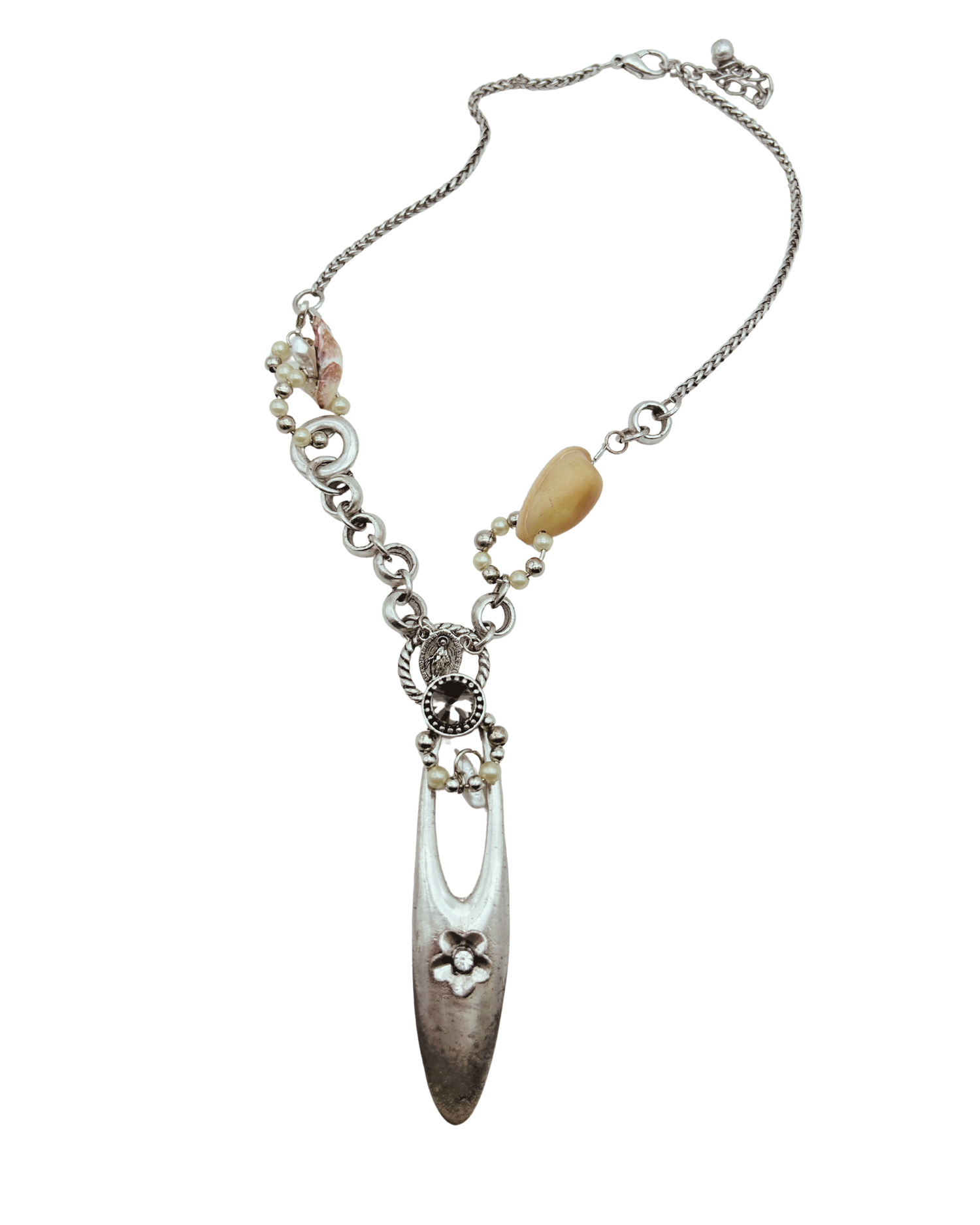 A small Mother Mary charm positioned above the crystal acts as a protective presence to guide the tides.